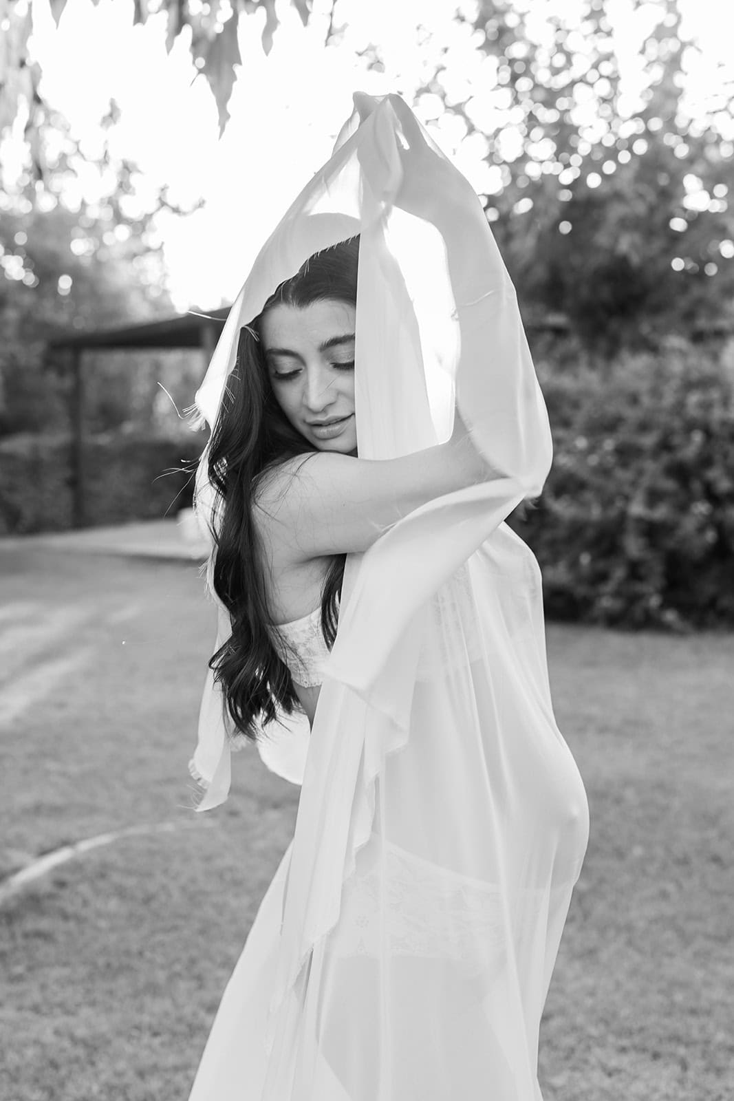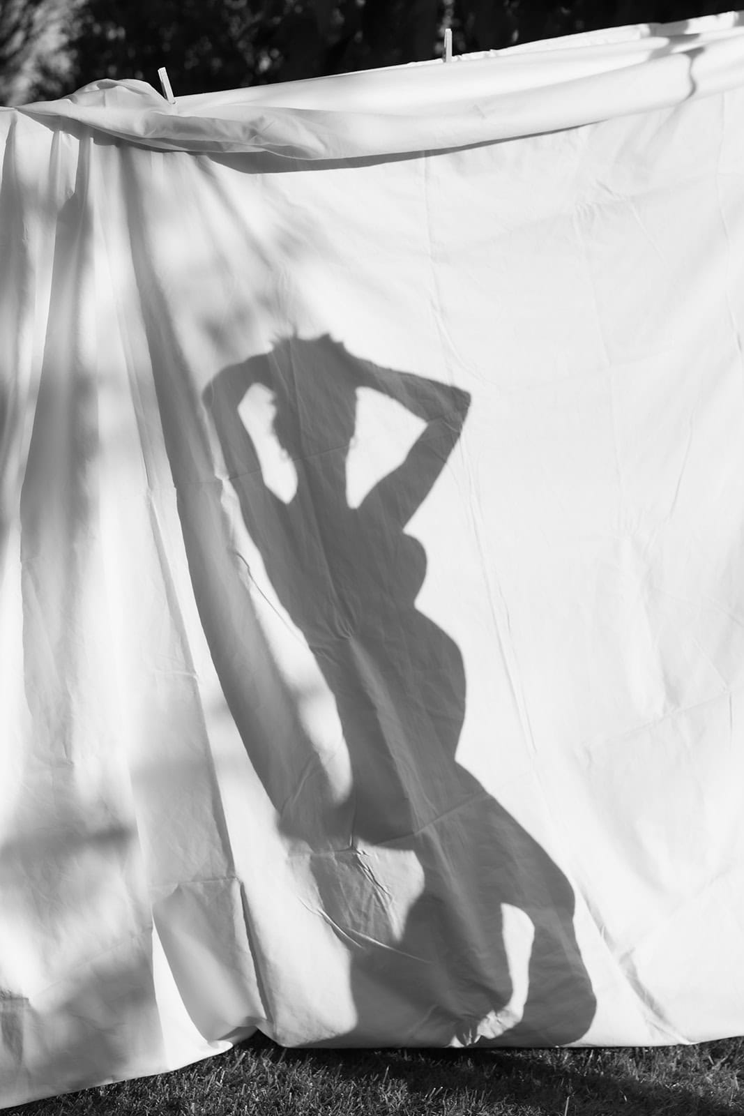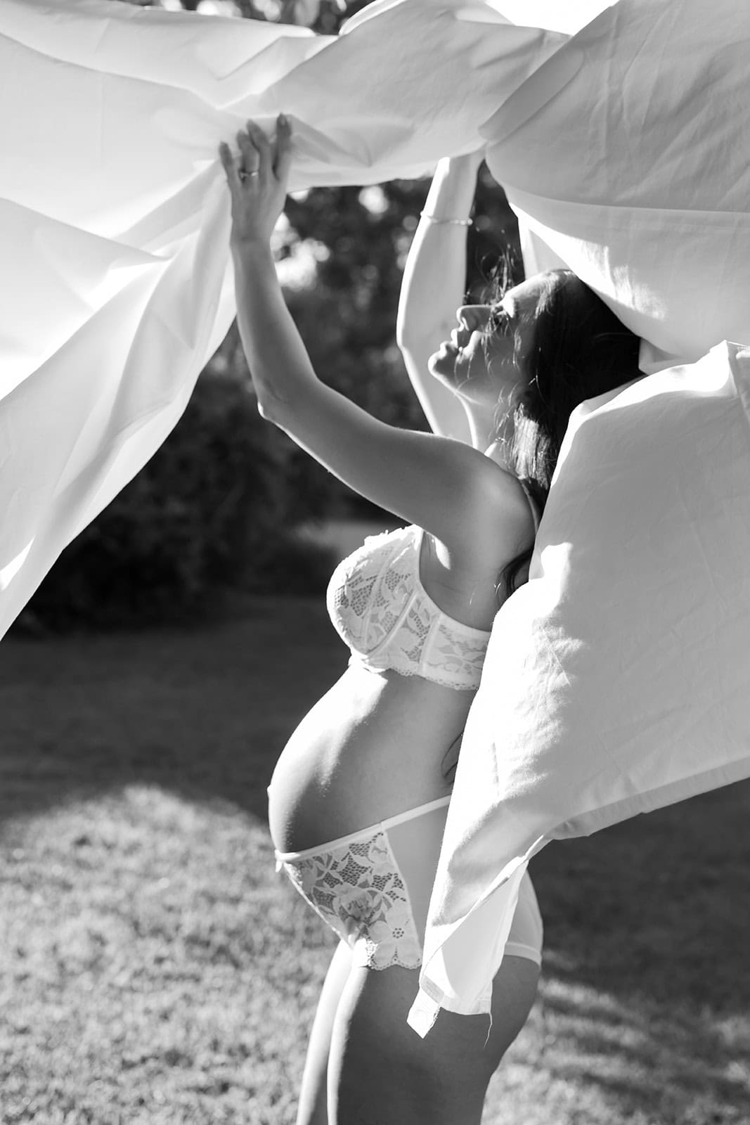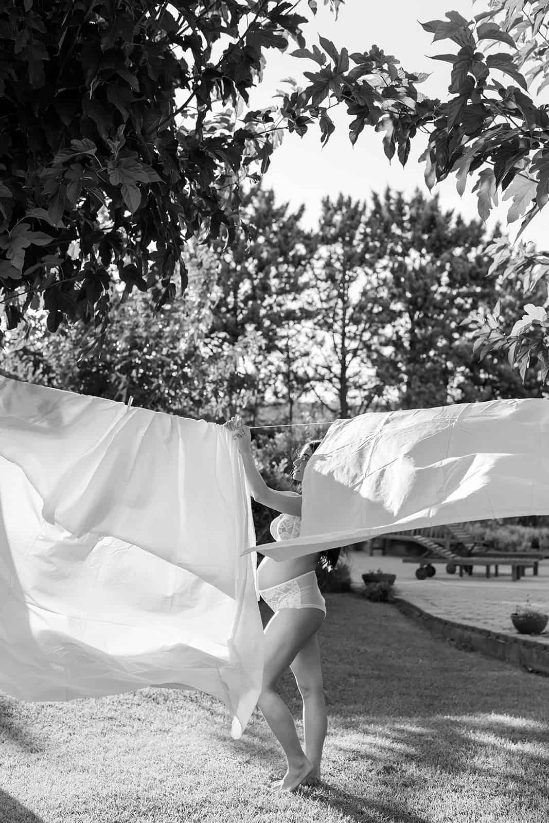 pregnant woman hanging laundry white sheets in black and white image by maternity photographer Anette Cook